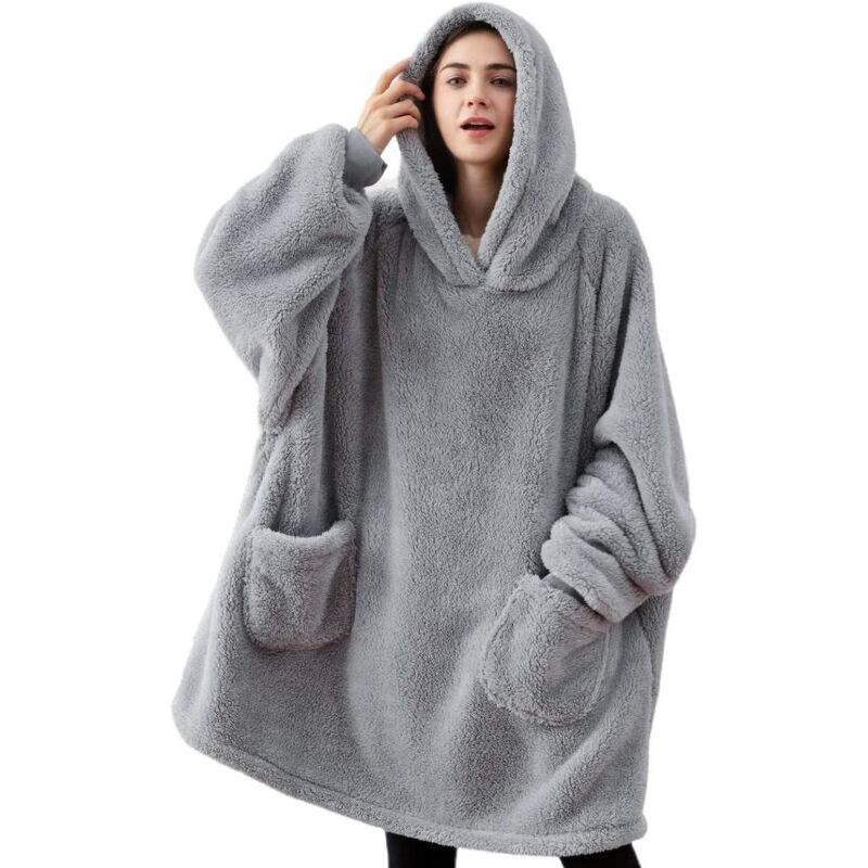 Sponsored OCXIN Adult Plaid Fleece Hoodie With Sleeve Women Men Hooded Blanket With Sleeves Portable Pockets, Plaid Sweater Blanket Sofa TV Winter, 95x85cm Gray